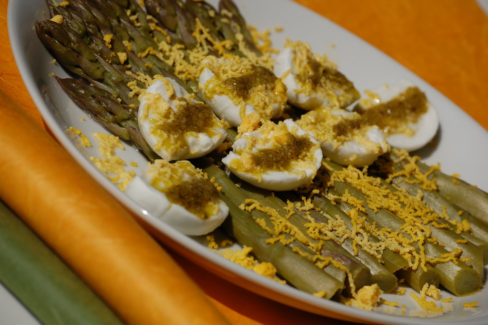 Másik egyszerű, bivalymozzarellás-petrezselyempestós zöldspárga: a zöldspárgát sós vízben megfőztem, egy tányéron a sípokat egymás mellé fektettem, rá bivalymozzarellát karikáztam, a mozzarellára petrezselyempestót csorgattam (olívaolaj, petrezselyemzöld, só és egy kevés bors mozsárban péppé zúzva), és az egészet megszórtam reszelt tojássárgájával.