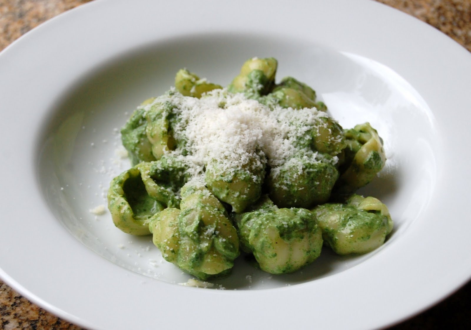 Egy serpenyőben az olívaolajat, alacsony lángon megpirítottam rajta a héjától megfosztott, kés élével kissé szétnyomott fokhagymagerezdet, hozzáadtam a fagyasztott spenótot, sóztam, borsot tekertem és szerecsendiót reszeltem rá, majd a spenót kiolvadásától számítva nem több mint 3 percig főztem. Ekkor levettem a tűzről, hozzáadtam a ricottát, belereszeltem a pecorinot (egy keveset félretettem a tálaláshoz), botmixerrel az egészet pürésítettem (jól megdolgoztam, hogy krémes legyen), majd újra visszatettem a tűzhelyre, hozzáadtam néhány evőkanálnyit a tészta főzővizéből, hogy a megfelelő állagot elérje, és egyet forraltam rajta.