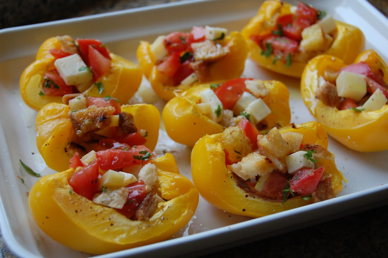 Hozzávalók: 3 kaliforniai paprika, 4 közepes, érett fürtös paradicsom, 160 g füstölt scamorza, 2 szelet kenyér, extraszűz olívaolaj, egy csokor petrezselyemzöld, só, bors