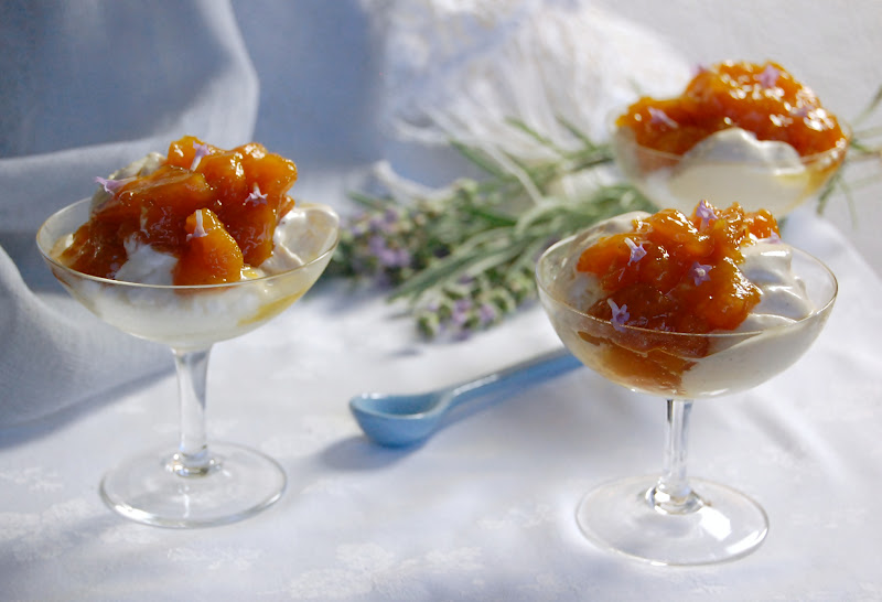 A maradék tejszínt félig felverjük, a hideg vaníliás alapba keverjük, és fagylaltgép tartályában kb. 30 perc alatt kifagyasztjuk.Poharak aljára habcsókot morzsálunk, rá vaníliafagyit kanalazunk, a fagyira meleg sült barackot csorgatunk, és végül megszórjuk néhány levendulavirággal.