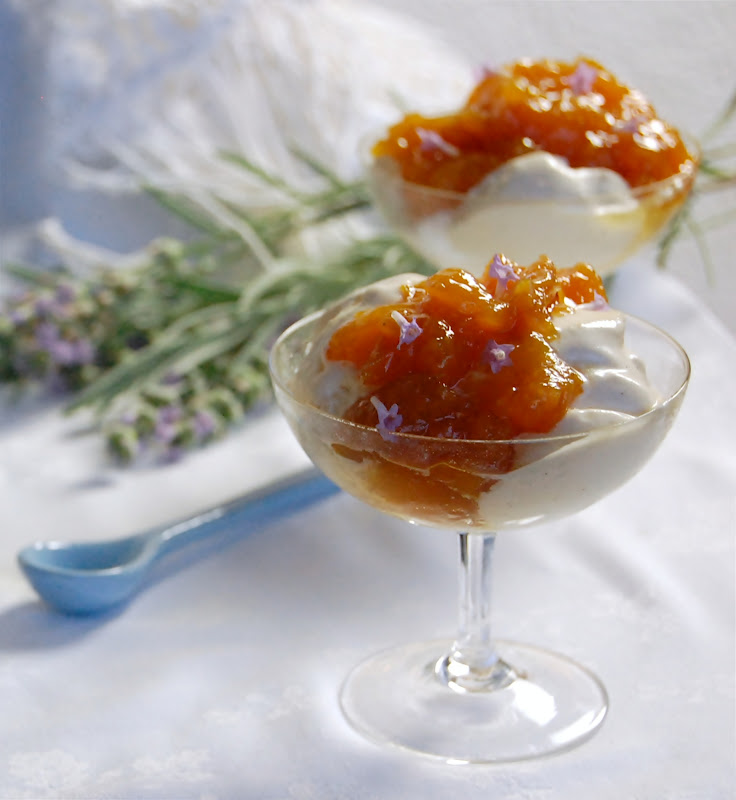 A maradék tejszínt félig felverjük, a hideg vaníliás alapba keverjük, és fagylaltgép tartályában kb. 30 perc alatt kifagyasztjuk.Poharak aljára habcsókot morzsálunk, rá vaníliafagyit kanalazunk, a fagyira meleg sült barackot csorgatunk, és végül megszórjuk néhány levendulavirággal.