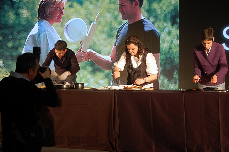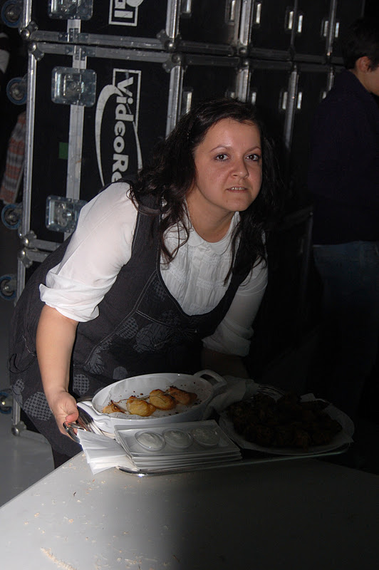 A versenyről is írok néhány szót. Hárman voltunk tehát, Stefania Brocca, aki sütőtökkel és tőkehallal töltött raviolit készített, és Stefania Brocca, aki sütőtökkel töltött tésztacukorkákat készített sült zsályalevelekkel és ropogós fricoval. A körülmények, ahogy korábban említettem végül tényleg szinte táborira sikerültek, a legrosszabb az volt, hogy sötétben kellett főzni, ugyanis azzal nem számoltak az elején, hogy ha felkapcsolaják a villanyt, mivel csak egy óriási fehér függöny választott el minket a nagyteremtől, ott felborul az egész fényösszeállítás. Végül Ember a fényképezőgép vakujával világított hol az én, hol a másik két versenyző serpenyőjébe, hogy azért lássuk, mi történik benne.