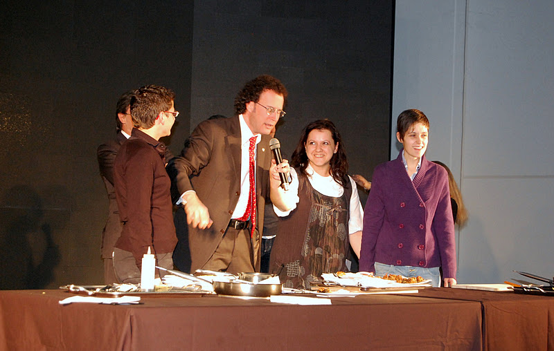 …aztán valamit mondtam még a borról is, de erre a részre már őszintén szólva nem emlékszem, mert akkor a zsűri tagjai összedugták a fejüket, a zsűri elnöke odajött hozzám, megkérdezte, hogy mi az étel pontos neve, honnan jöttem, és hogy melyik étteremben dolgozom (x-)))), aztán a műsorvezető kérte, hogy csinálunk úgy mint a Miss Italiában, fogjuk meg egymás kezét, és aki nyer, el ne felejtsen majd sírni (mindenki majd’megszakadt a nevetéstől, én, aki sem külsőre, sem alkatra különösen nem vagyok egy Miss Italia típus, még jobban), és kihirdették, hogy nyertem.
