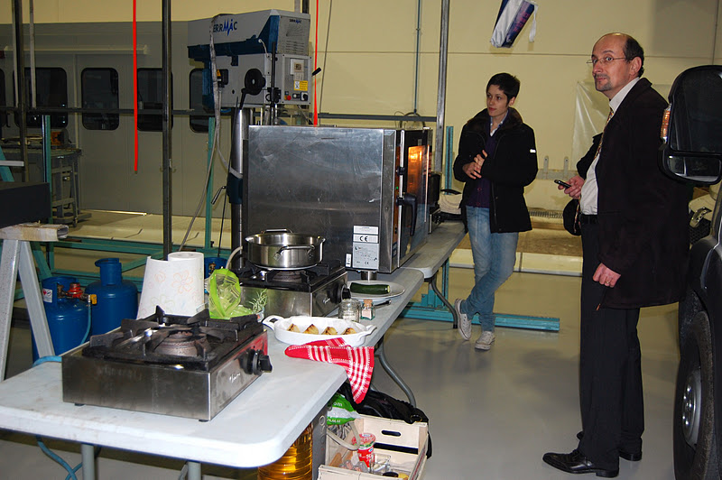 Fél hatra hívtak minket, sikerült időben odaérni, de azonnal közölték, hogy változott a helyzet, a színpadon csak tálalni fogunk. (Halleluja! Így már biztos, hogy meg fog sülni az alma, de azért szólhattatok volna kicsit hamarabb is…) Bevezettek minket egy jéghideg raktárrészbe, ahol millió cső, hatalmas gépek, két kisteherautó, egy kisebb kamion és a legújabb 911-es Porsche társaságában, egy nem túl hosszú asztalon, három gázzsámoly ült. Azonnal követeltem a sütőmet, ami pillanatokon belül meg is érkezett. És innentől kezdve elég lassan vánszorgott az idő. Ténferegtünk, nézelődtünk, figyeltük, hogy készülnek a séfek, az étteremtulajdonosok, hogy nyüzsög mindenki.